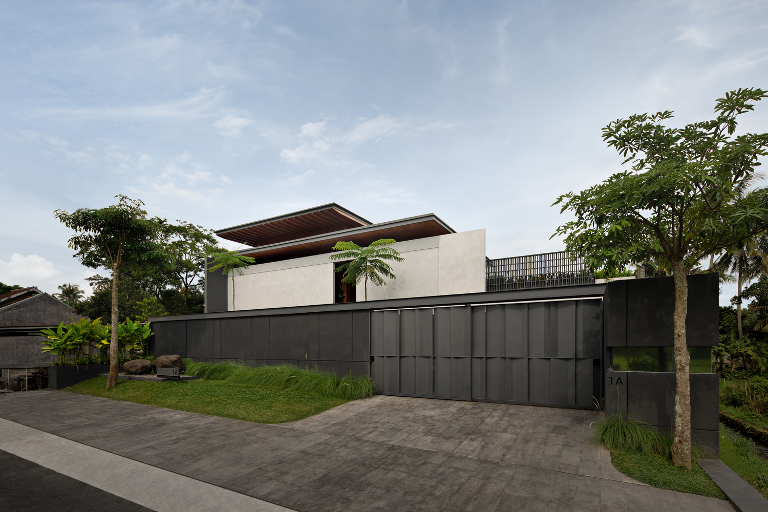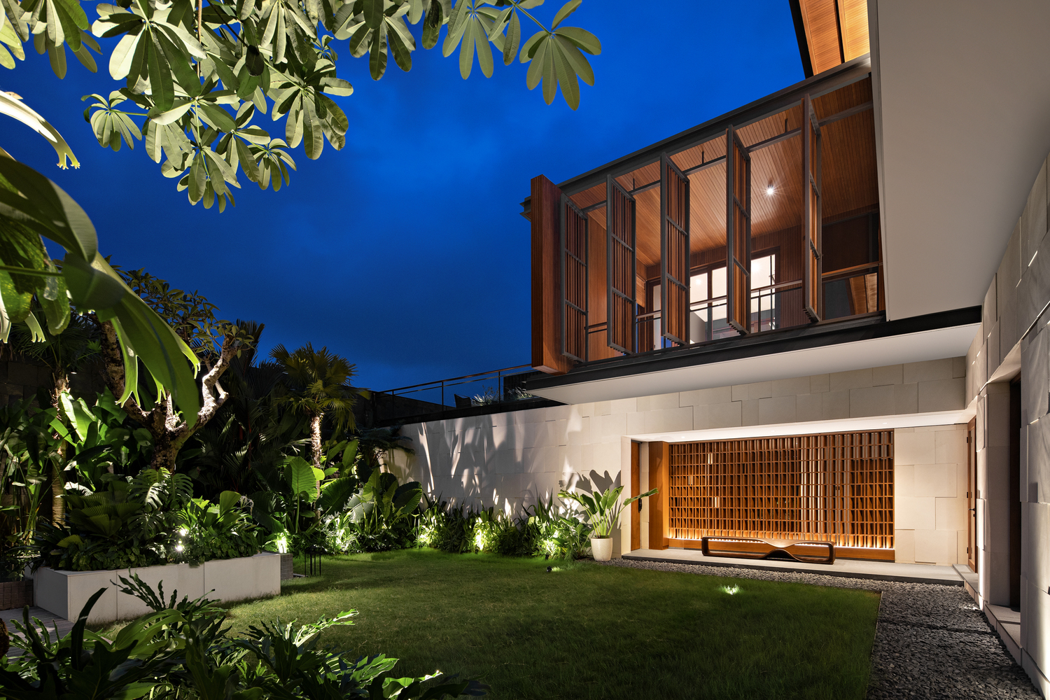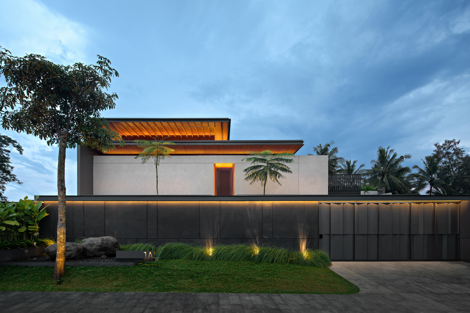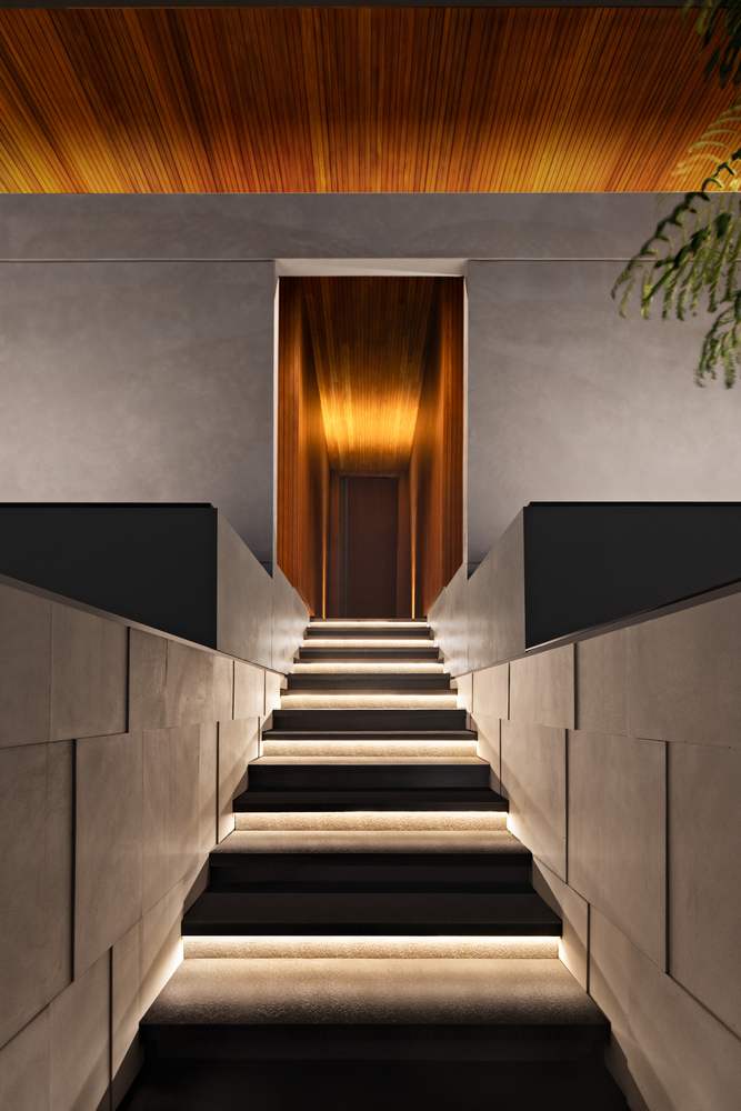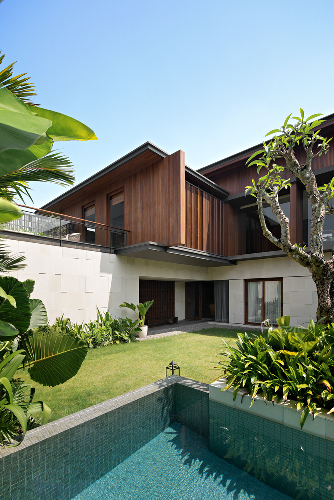 Thiết kế của ngôi nhà này tập trung vào các yếu tố tạo ra tông màu đất-nhiệt đới, chẳng hạn như gỗ, đá và bê tông. Mặt tiền được thiết kế với các yếu tố vững chắc để mang lại sự riêng tư và an toàn cho ngôi nhà, vì vị trí của nó. Khi bước vào khu vực riêng tư, sân trong được thiết kế với một bãi cỏ lớn trồng nhiều cây nhiệt đới và một hồ bơi chính là điểm thu hút của ngôi nhà. Hồ bơi được thiết kế liên thông với khu vực chung bằng cầu thang ngoài trời.