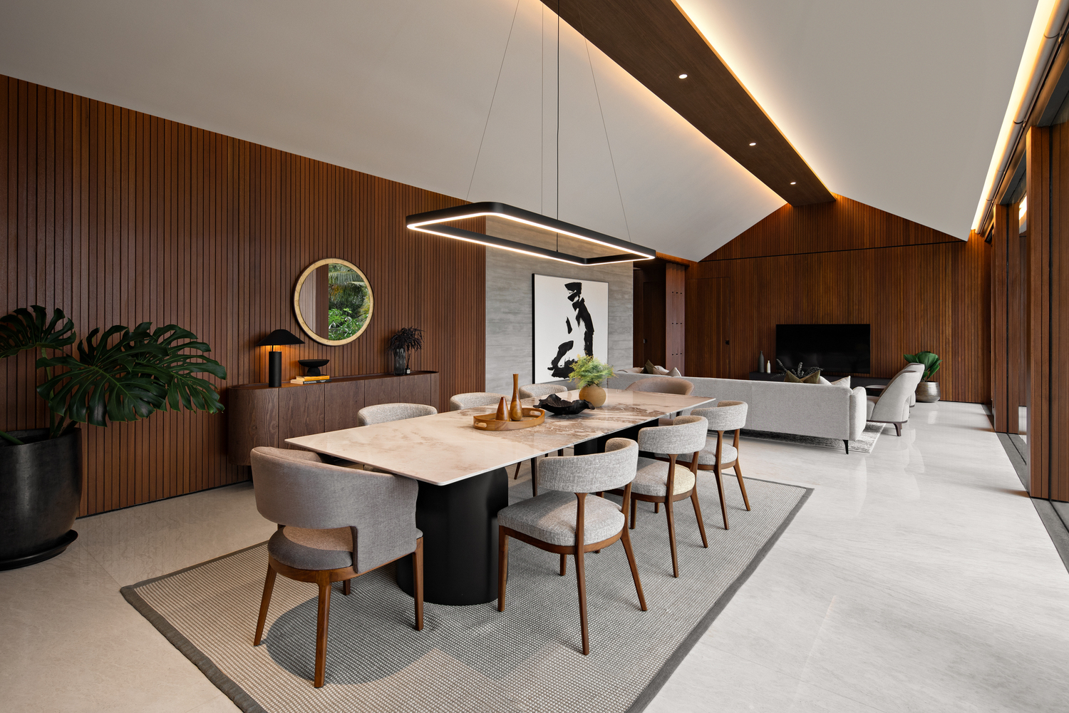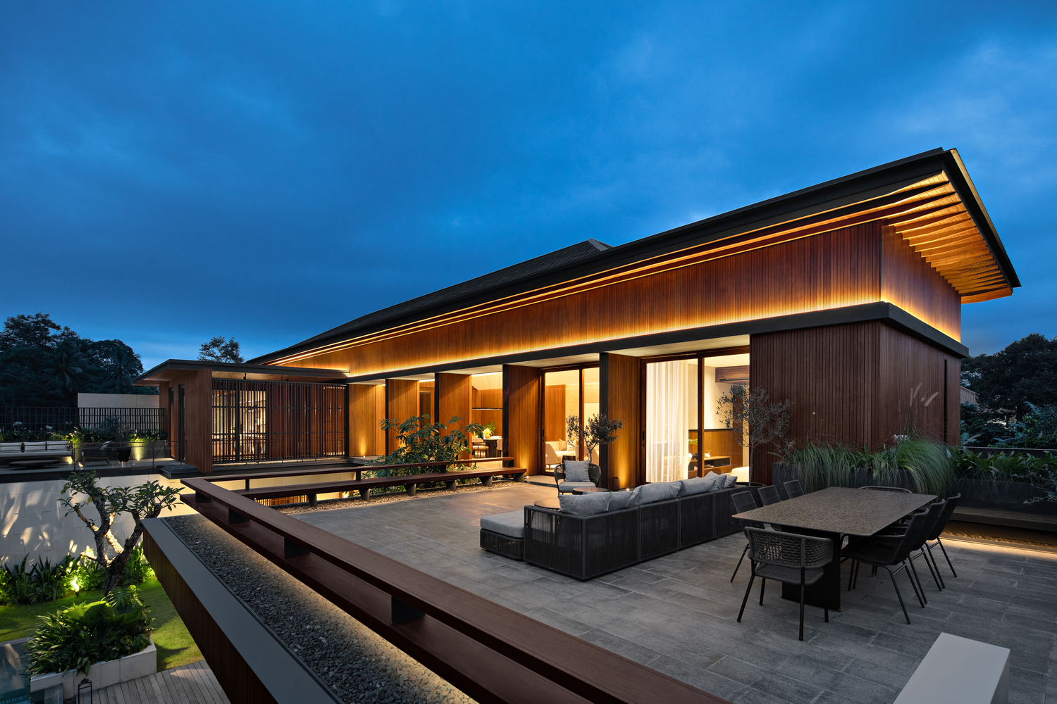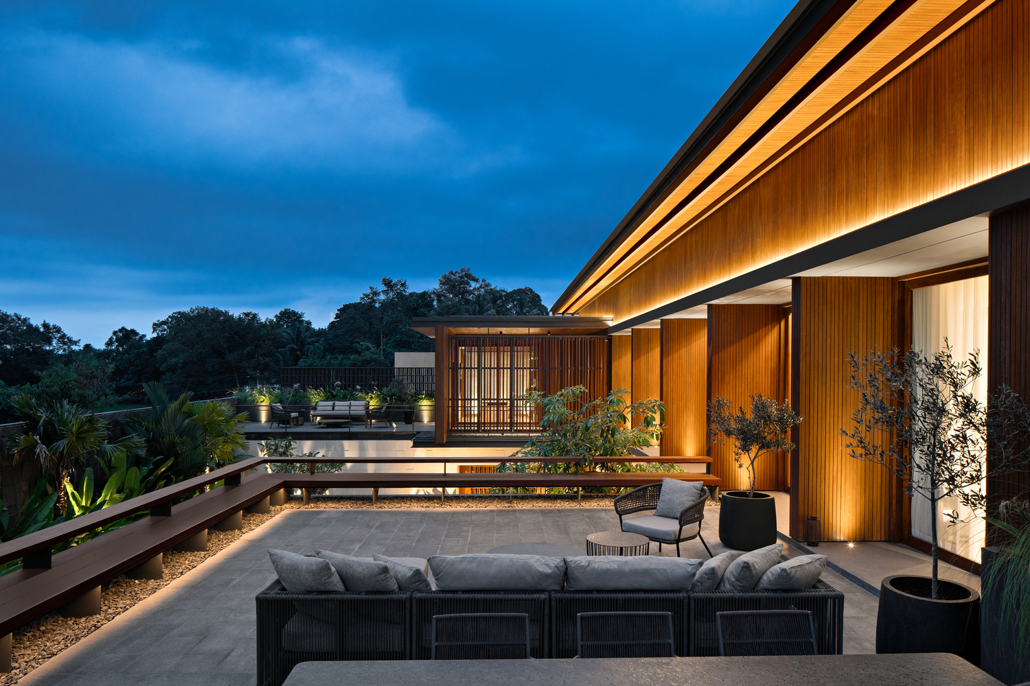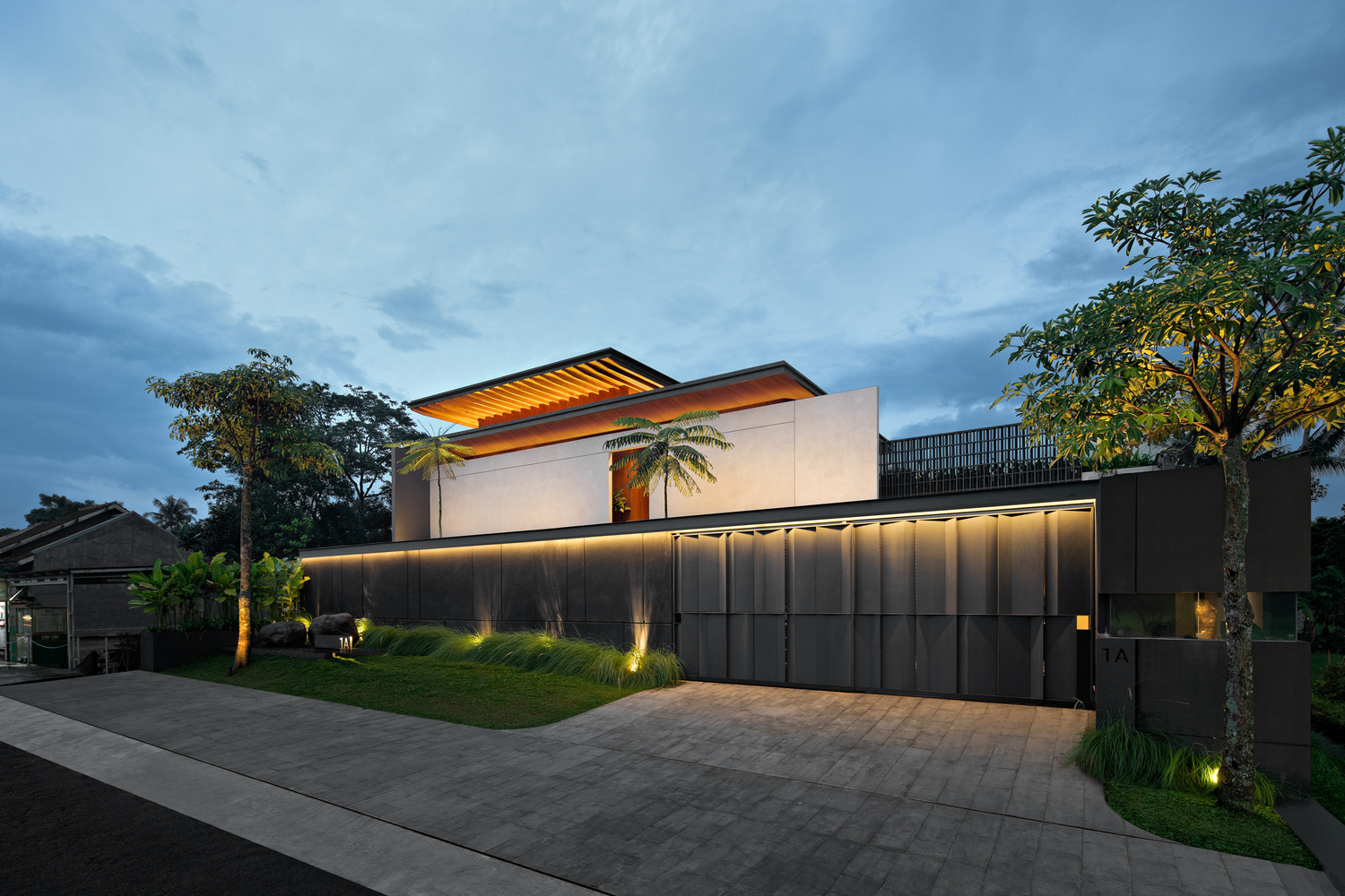 Thiết kế của ngôi nhà này tập trung vào các yếu tố tạo ra tông màu đất-nhiệt đới, chẳng hạn như gỗ, đá và bê tông. Mặt tiền được thiết kế với các yếu tố vững chắc để mang lại sự riêng tư và an toàn cho ngôi nhà, vì vị trí của nó. Khi bước vào khu vực riêng tư, sân trong được thiết kế với một bãi cỏ lớn trồng nhiều cây nhiệt đới và một hồ bơi chính là điểm thu hút của ngôi nhà. Hồ bơi được thiết kế liên thông với khu vực chung bằng cầu thang ngoài trời.