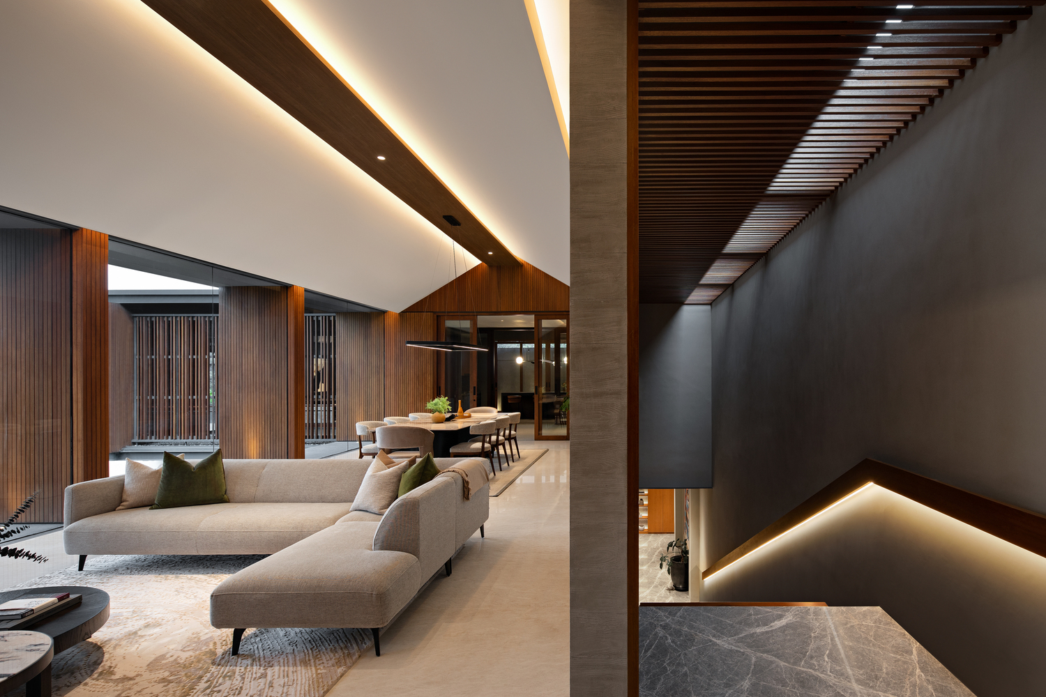 Lối đi thứ hai được thiết kế để trở thành khu vực chung có thể đi lên từ cầu thang dài dẫn đến lối vào chính. Khi bước vào nhà là khu vực tiền sảnh kết nối phòng chứa thức ăn, phòng làm việc và lối vào dịch vụ. Khu vực tiếp khách – ăn uống được thiết kế theo mặt bằng mở với các yếu tố xuyên suốt để mọi người có thể phóng tầm nhìn ra xung quanh.