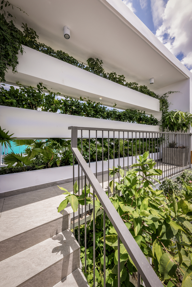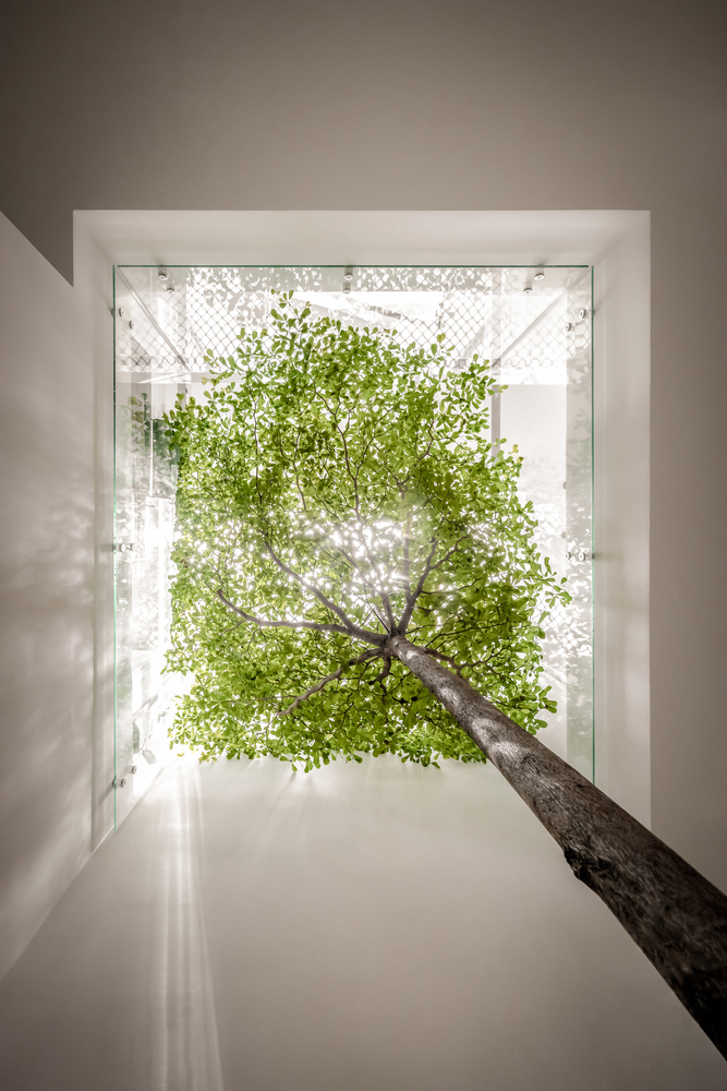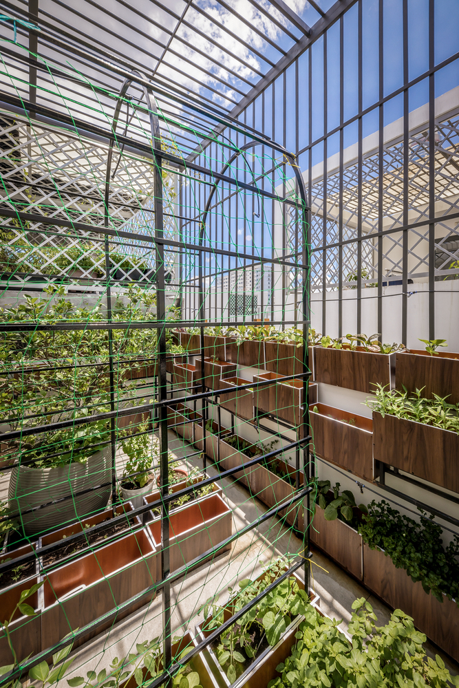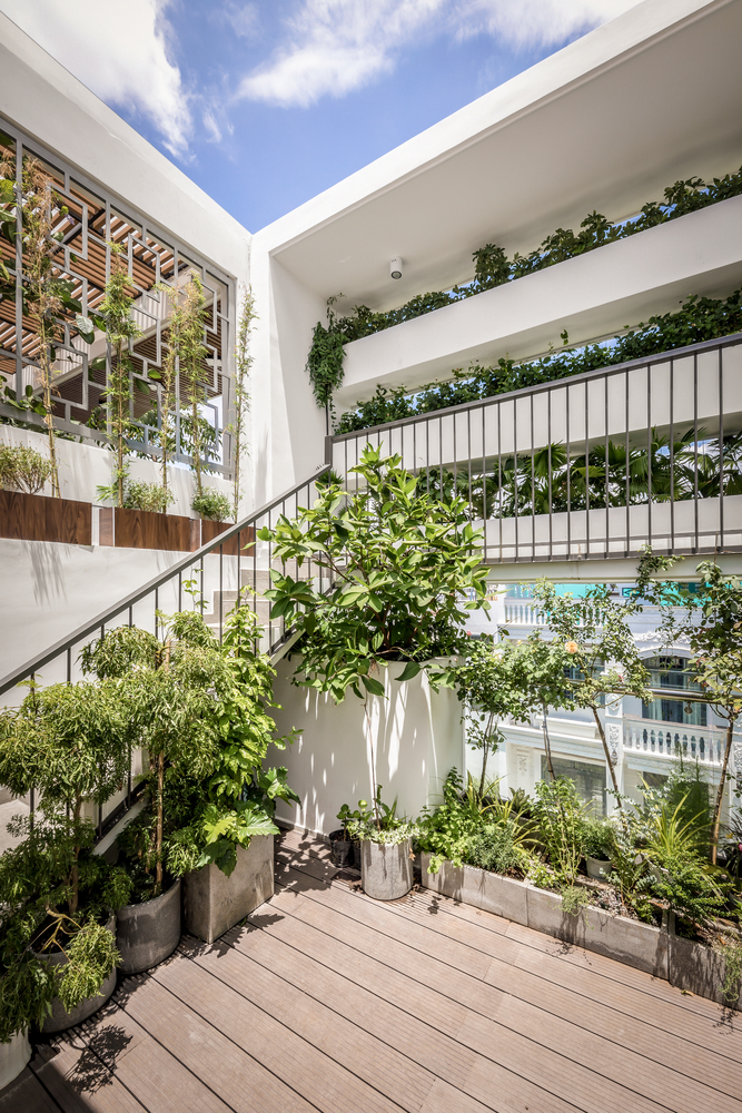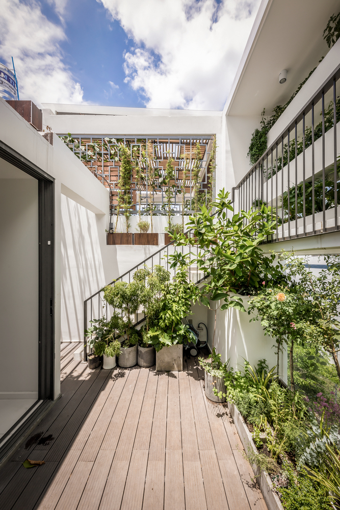 Một khoảng trống lớn được đưa ra giữa nhà làm ống thông gió cho mọi không gian. Ánh sáng mặt trời và gió có thể lọt vào nhờ mái kính và cửa gió bằng nhôm trên đỉnh. Hai khu vườn nhỏ ở giữa và sau tầng trệt làm không gian xanh cho ngôi nhà này.