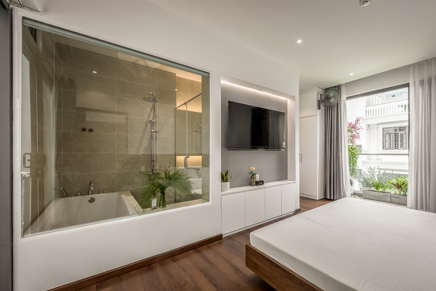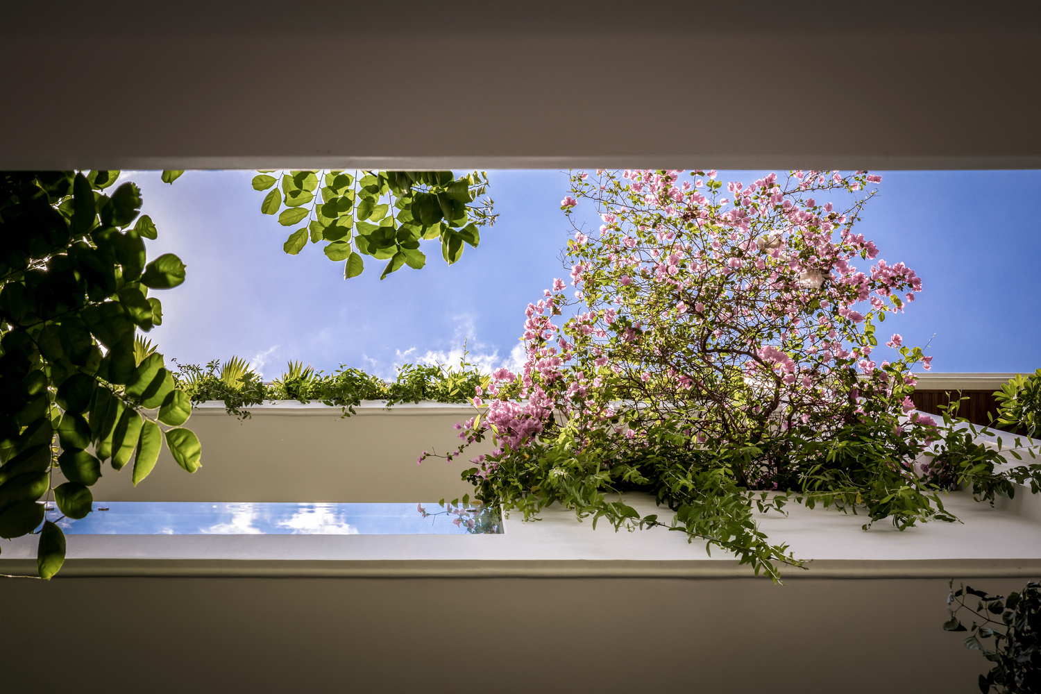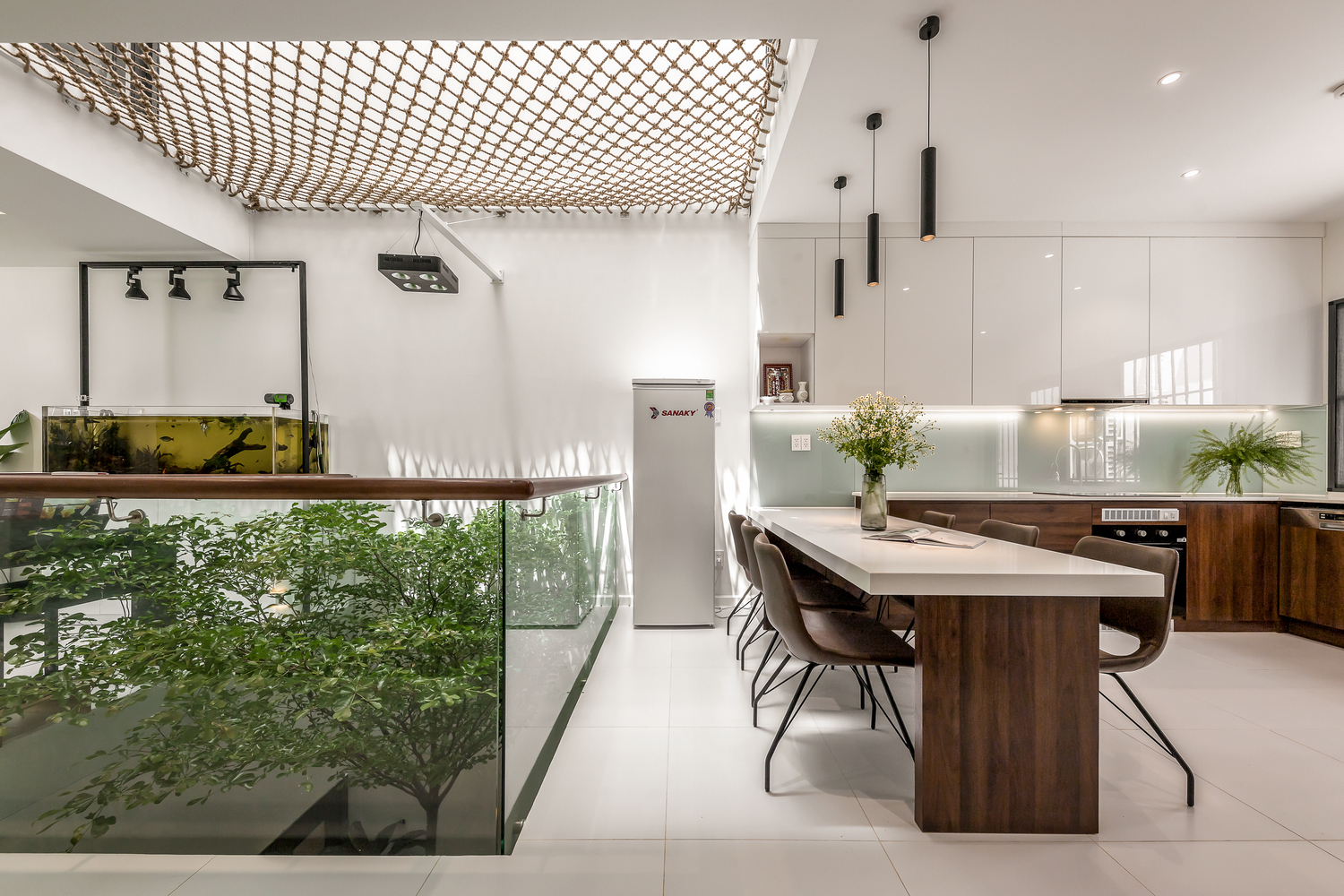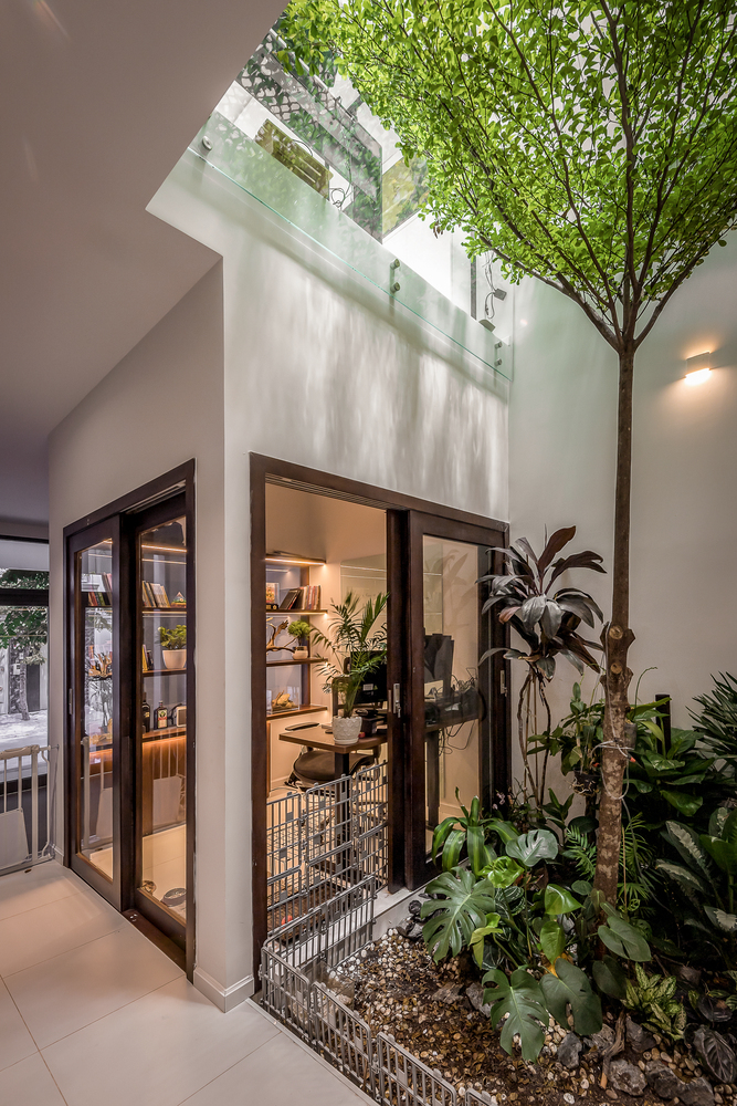Phòng ngủ của người lớn được bố trí thêm giữa 2 sân vườn ở tầng trệt, 2 phòng ngủ cho con 5 tuổi và bố mẹ ở tầng 2, không gian ăn uống ở tầng 1 là không gian chung để mọi thành viên có thể quây quần bên nhau. Mọi khu vực đều có hai mặt thông gió ra khoảng trống hoặc sân vườn bằng cửa trượt để tạo sự thông thoáng xuyên suốt. Trên tầng thượng có một phòng tập thể dục nhỏ mở ra sân vườn, nơi có thể quan sát ánh nắng qua tán cây vào buổi sáng.